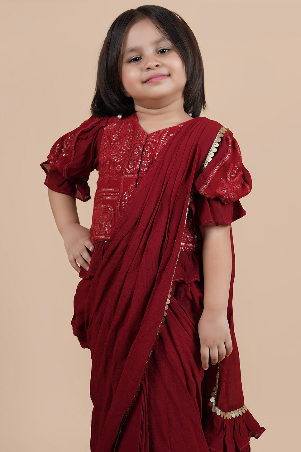 Whether it's a festive celebration, a wedding ceremony, or a formal gathering, this ensemble is sure to make a statement. It effortlessly combines traditional charm with contemporary elegance, making it a must-have addition to any girl's wardrobe.