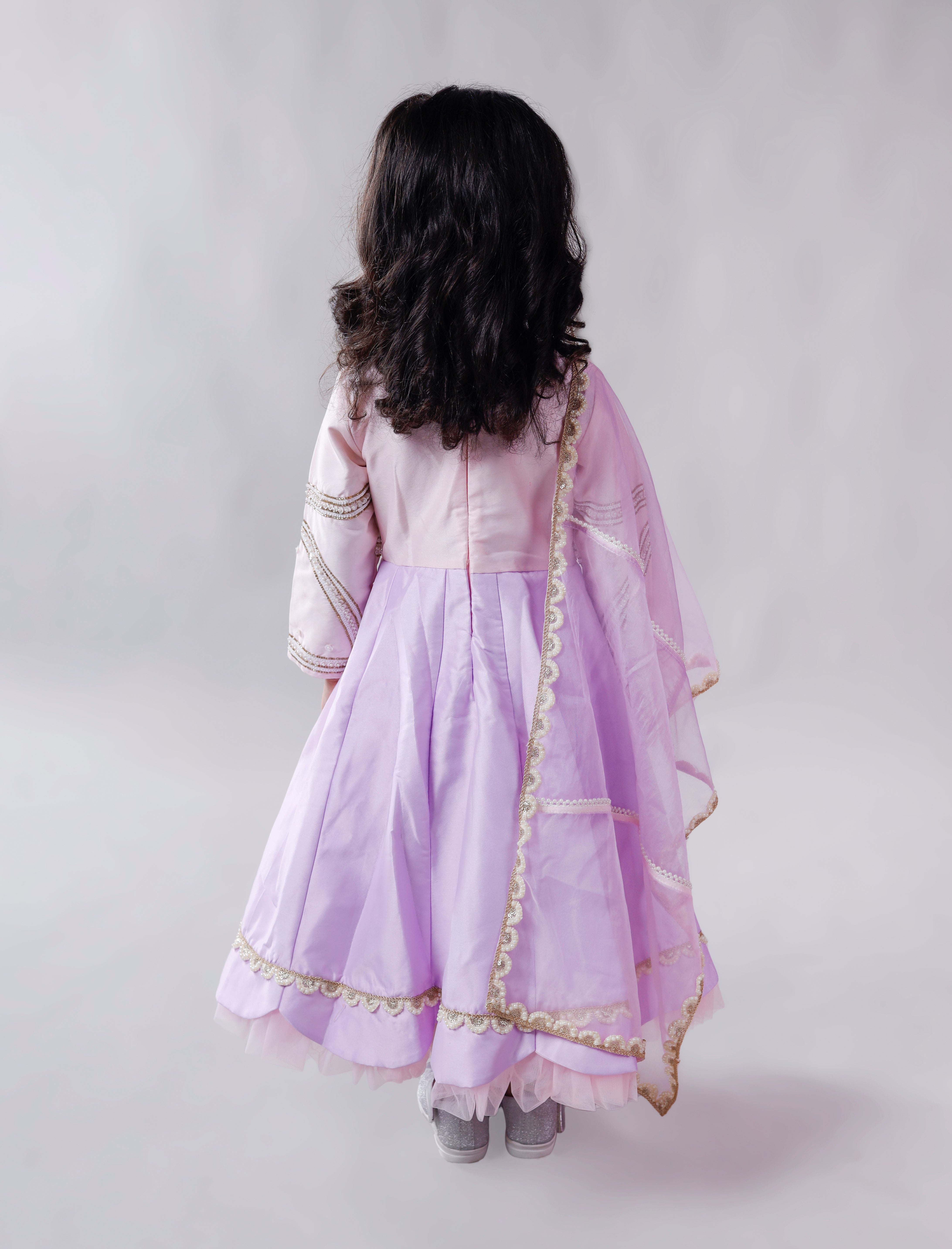 The little girl is wearing a charming pastel lavender lehenga set, featuring delicate embroidery on the bodice and dupatta, with scalloped golden lace detailing that adds a touch of festive elegance to the flowy, layered skirt.