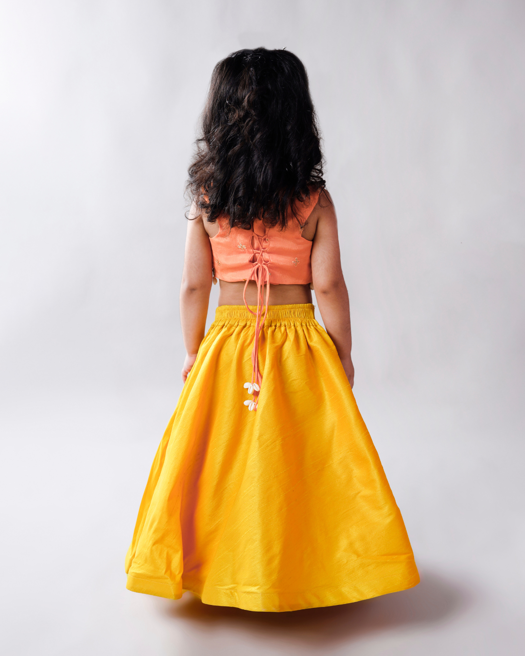 This adorable outfit is a vibrant traditional ensemble for a little girl, featuring a sleeveless orange blouse adorned with delicate golden embroidery and embellished shell details along the hem. The blouse is paired with a bright yellow flared skirt that adds a playful and festive touch. A matching orange potli bag with shells and pearl handle completes the look, adding charm and practicality. The entire outfit blends cheerful colours with ethnic patterns, perfect for festive occasions or cultural celebrations.