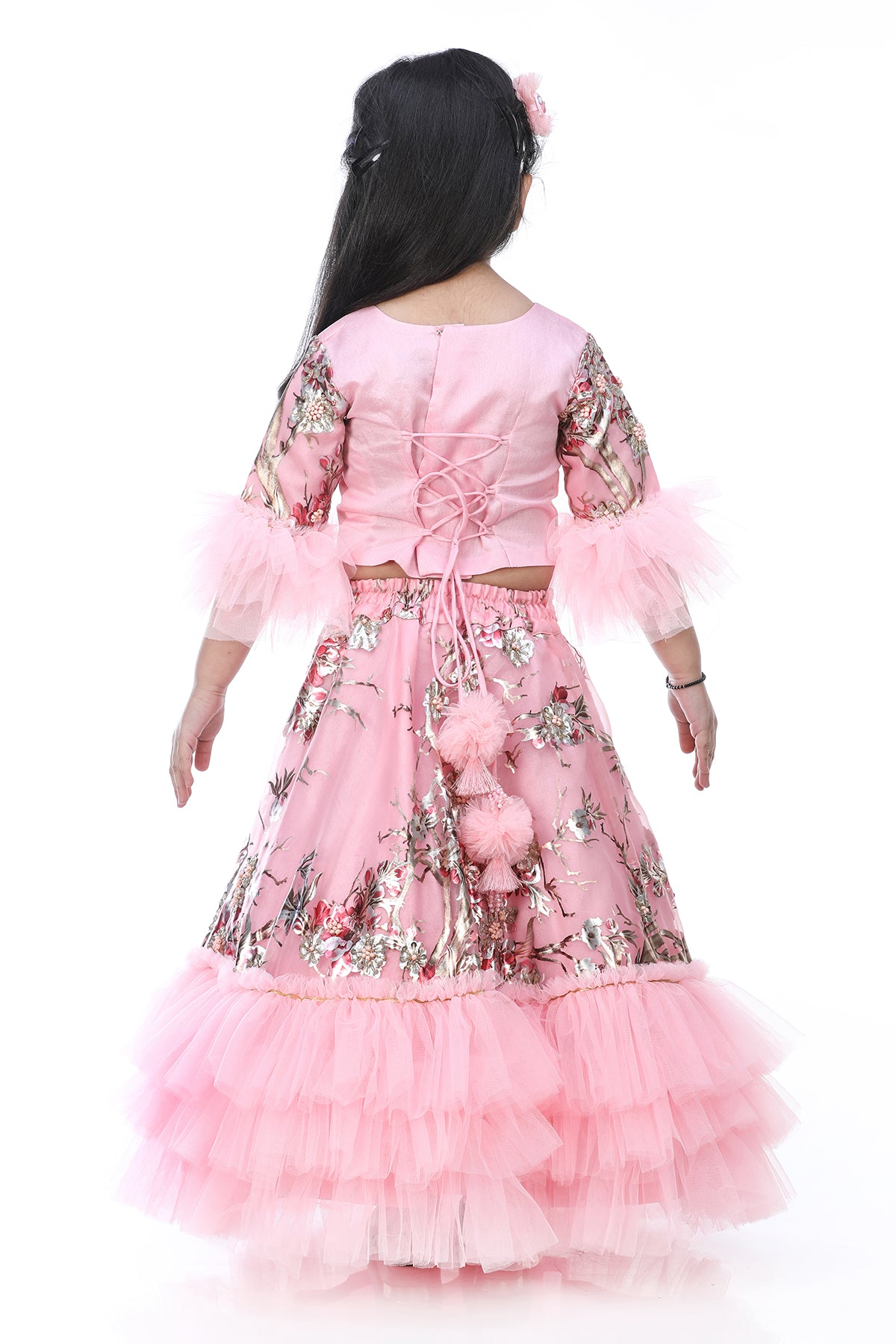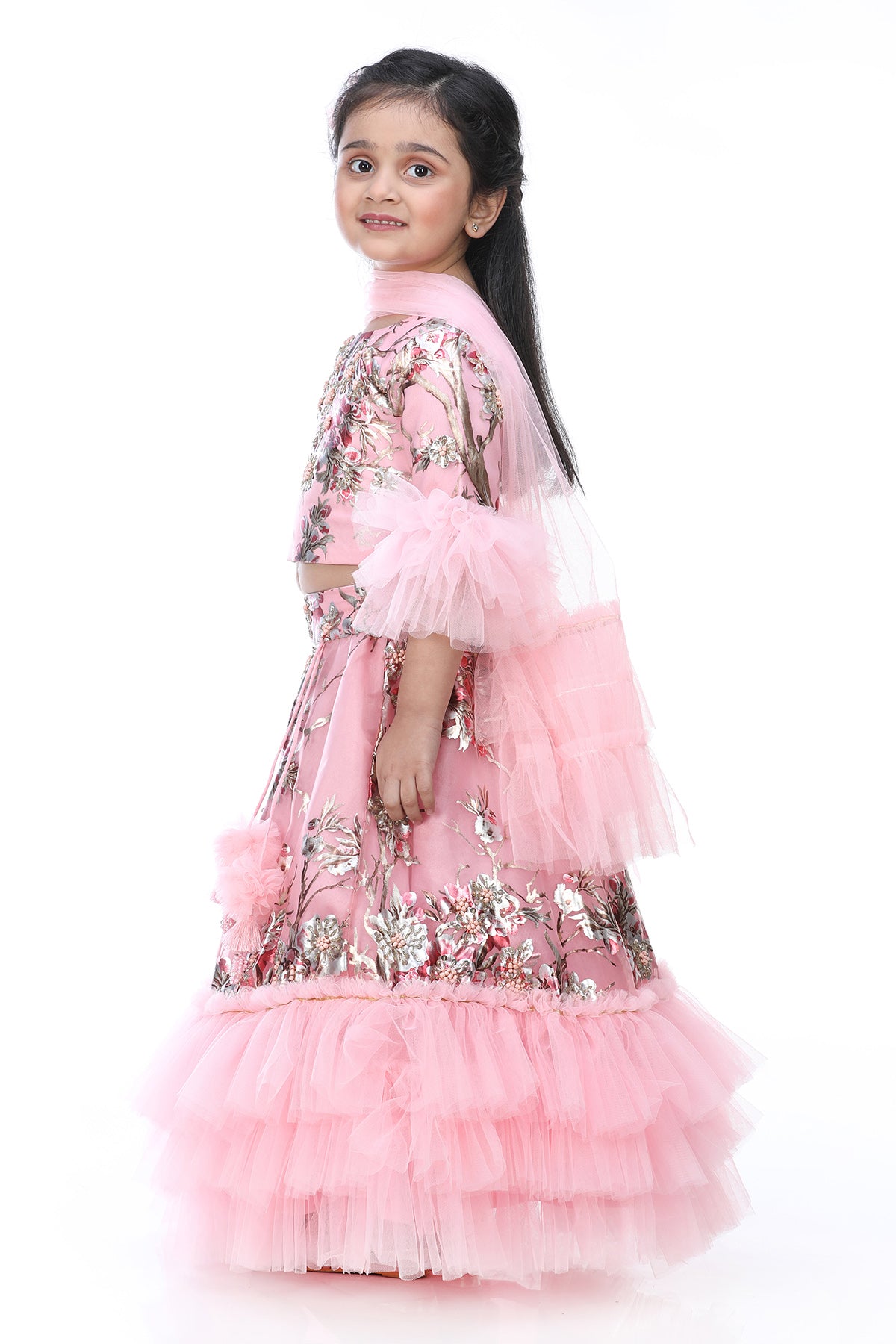 Pink Floral Print Lehenga Set for girls, a delightful ensemble exuding elegance and grace. Crafted with meticulous attention to detail, this ensemble features a vibrant pink lehenga adorned with intricate floral prints, offering a refreshing twist to traditional attire. The accompanying blouse complements the lehenga flawlessly, boasting a stylish design that accentuates her youthful appeal.