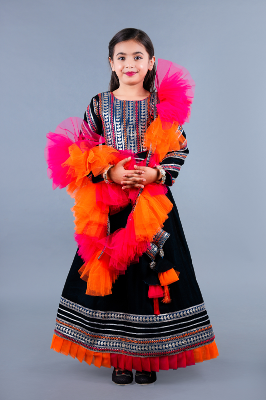 Dress your little princess in this exquisite Turquoise Blue Gotta Patti Work Lehenga Choli with Stylish Frilly Dupatta and watch her sparkle with joy and confidence!