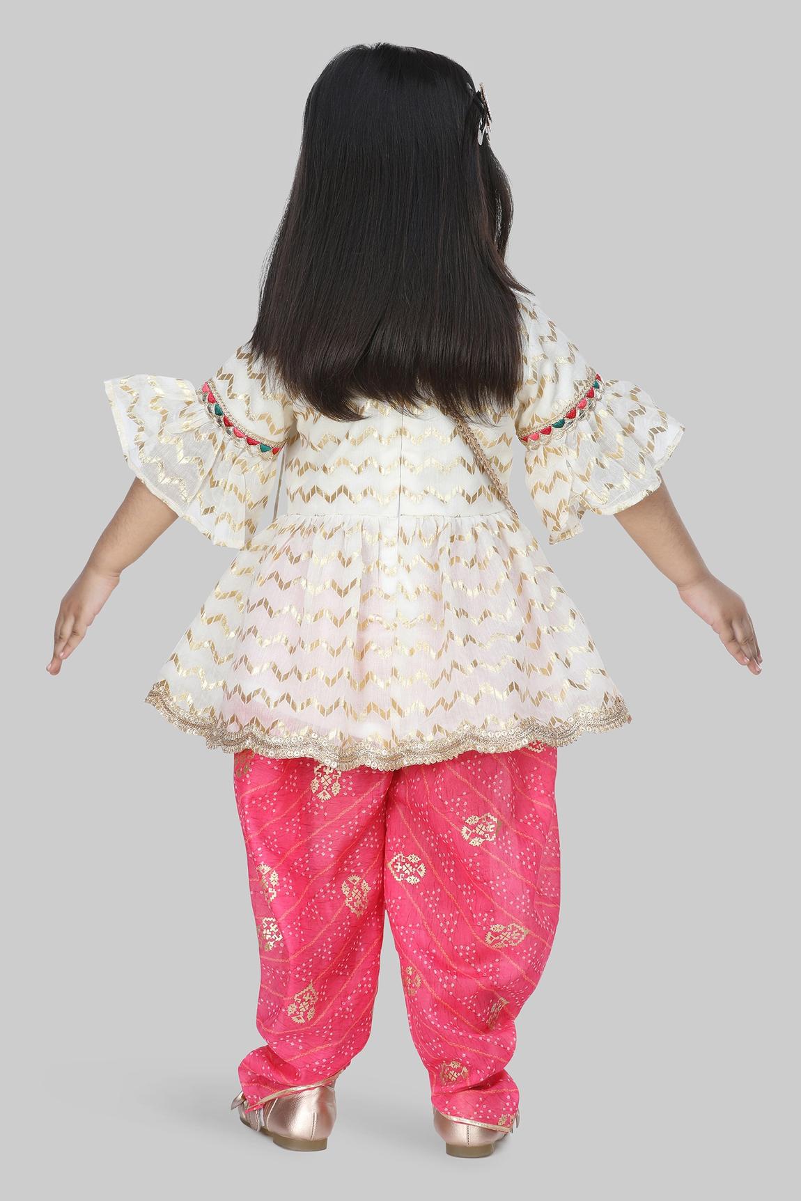 Ideal for special occasions or festive gatherings, this ensemble allows your daughter to showcase her unique sense of style with grace. Whether she's attending a family celebration or a cultural event, she'll steal the spotlight in this beautiful outfit. Pair it with her favorite accessories and footwear to complete the ensemble and watch her confidence soar. Let her shine brightly in our White Chanderi Kurta and Dhoti Pant Set, a timeless addition to her wardrobe.