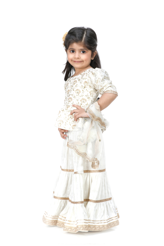 White Embellished Peplum and Sharara set, designed to make your little one shine on any occasion. Crafted with meticulous attention to detail, this ensemble features intricate embellishments that add a touch of elegance and charm. The peplum top boasts a flattering silhouette with delicate embroidery, enhancing its appeal. Paired with matching sharara pants, adorned with coordinating accents, this outfit exudes sophistication and grace. The soft fabric ensures comfort while maintaining a luxurious feel, allowing your child to move with ease and confidence. Whether it's a festive celebration or a special event, this ensemble is sure to steal the spotlight. Let your girl dazzle in our White Embellished Peplum and Sharara set, a timeless choice for making cherished memories.