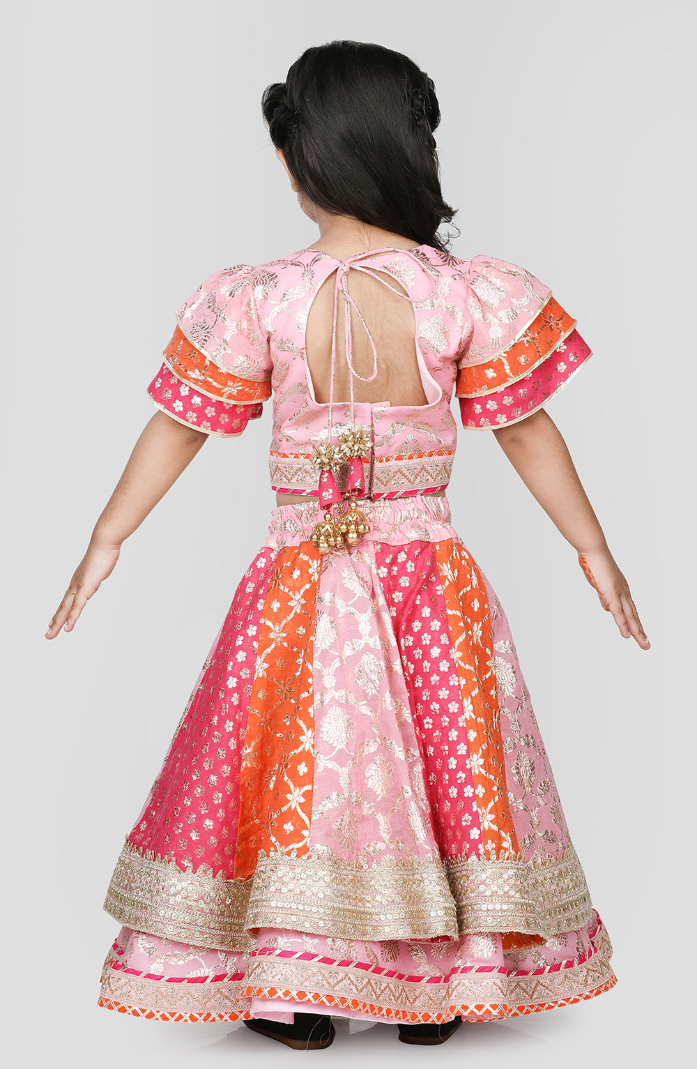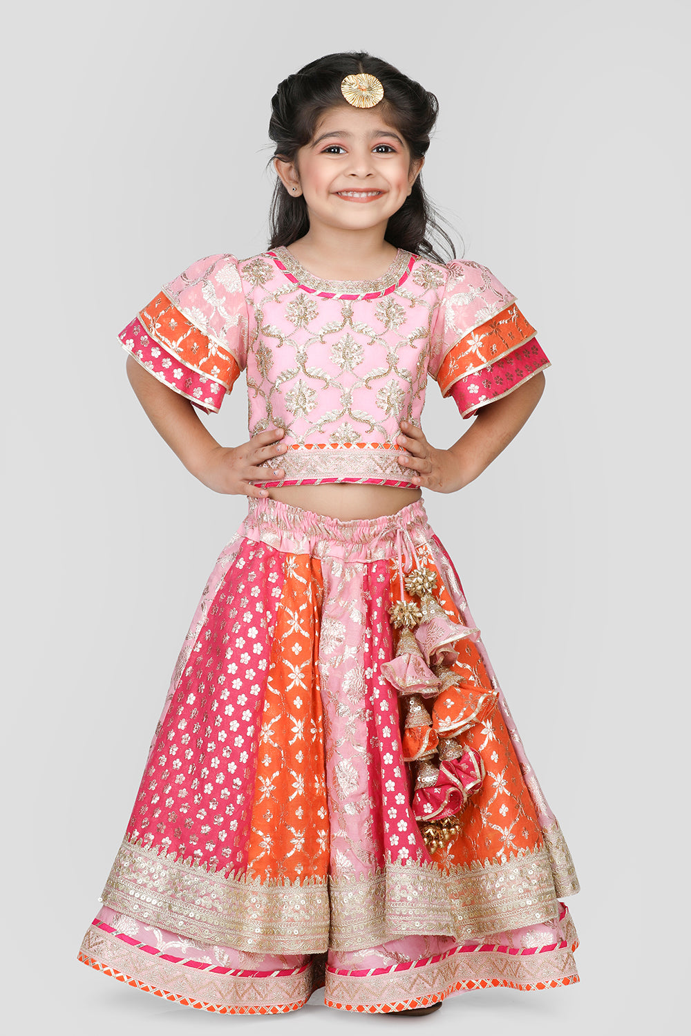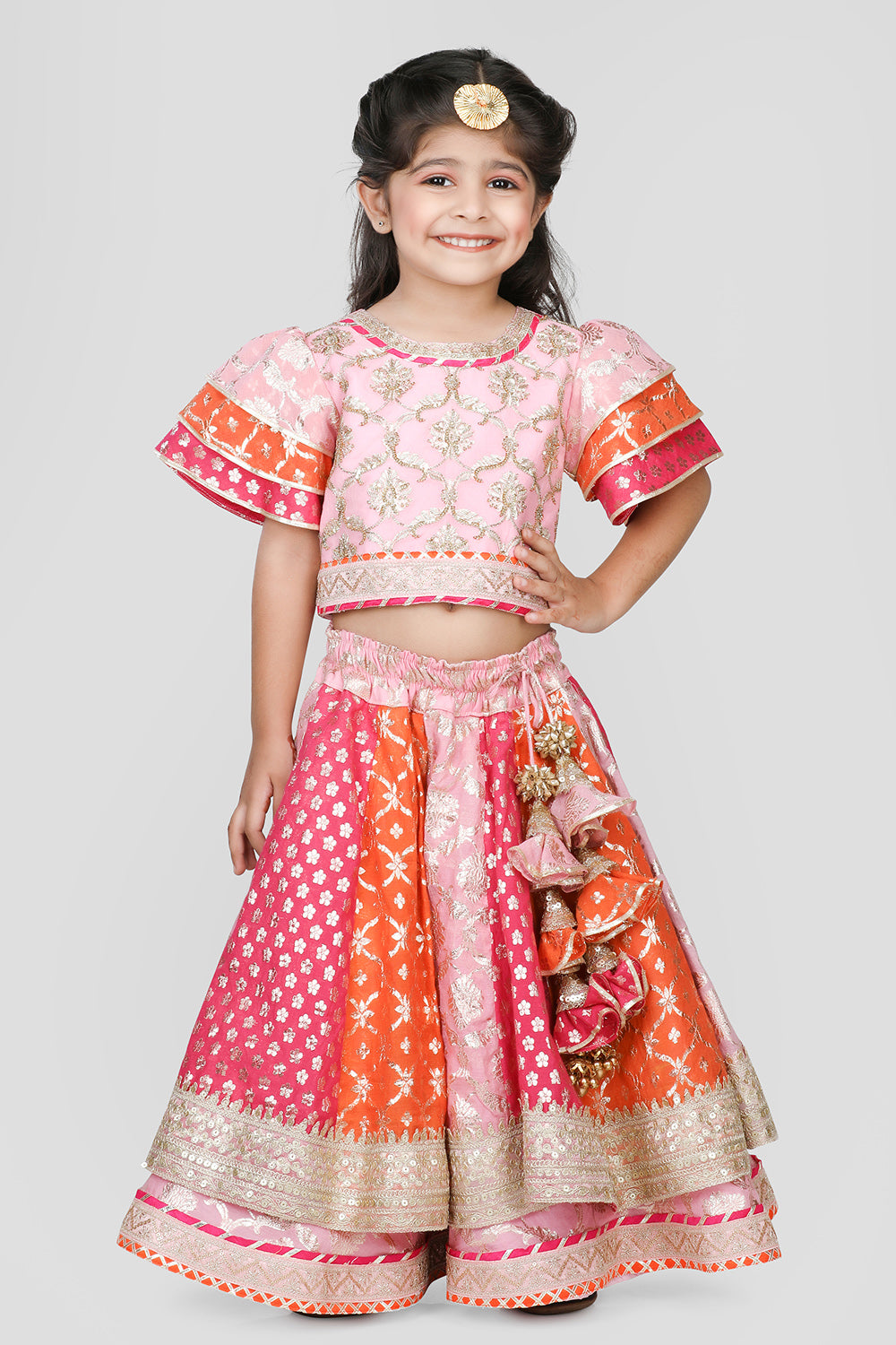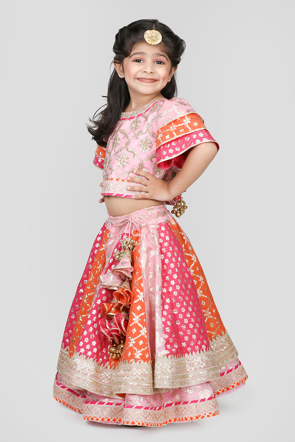 Zardozi Embroidered Top and Zari Thread Work Layered Lehenga. Crafted with meticulous attention to detail, this ensemble exudes elegance and charm. The intricately hand-embroidered Zardozi motifs on the top add a touch of regal flair, while the shimmering Zari thread work on the layered lehenga creates a mesmerizing effect. The top features a comfortable yet stylish silhouette, perfect for your girl to flaunt her festive spirit with confidence. The layered lehenga adds a playful twist to the traditional attire, making it ideal for weddings, parties, or any special occasion. Whether she's twirling on the dance floor or posing for pictures, she'll surely be the center of attention in this stunning ensemble. Dress her in our Zardozi Embroidered Top and Zari Thread Work Layered Lehenga and let her shine bright like a little princess!